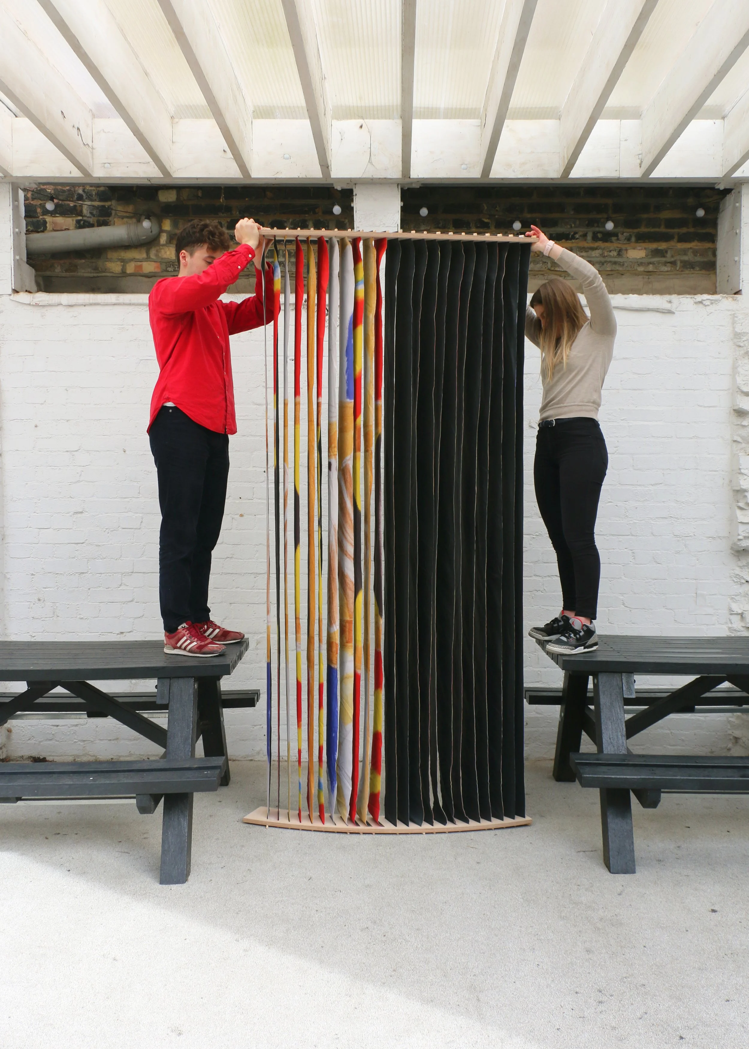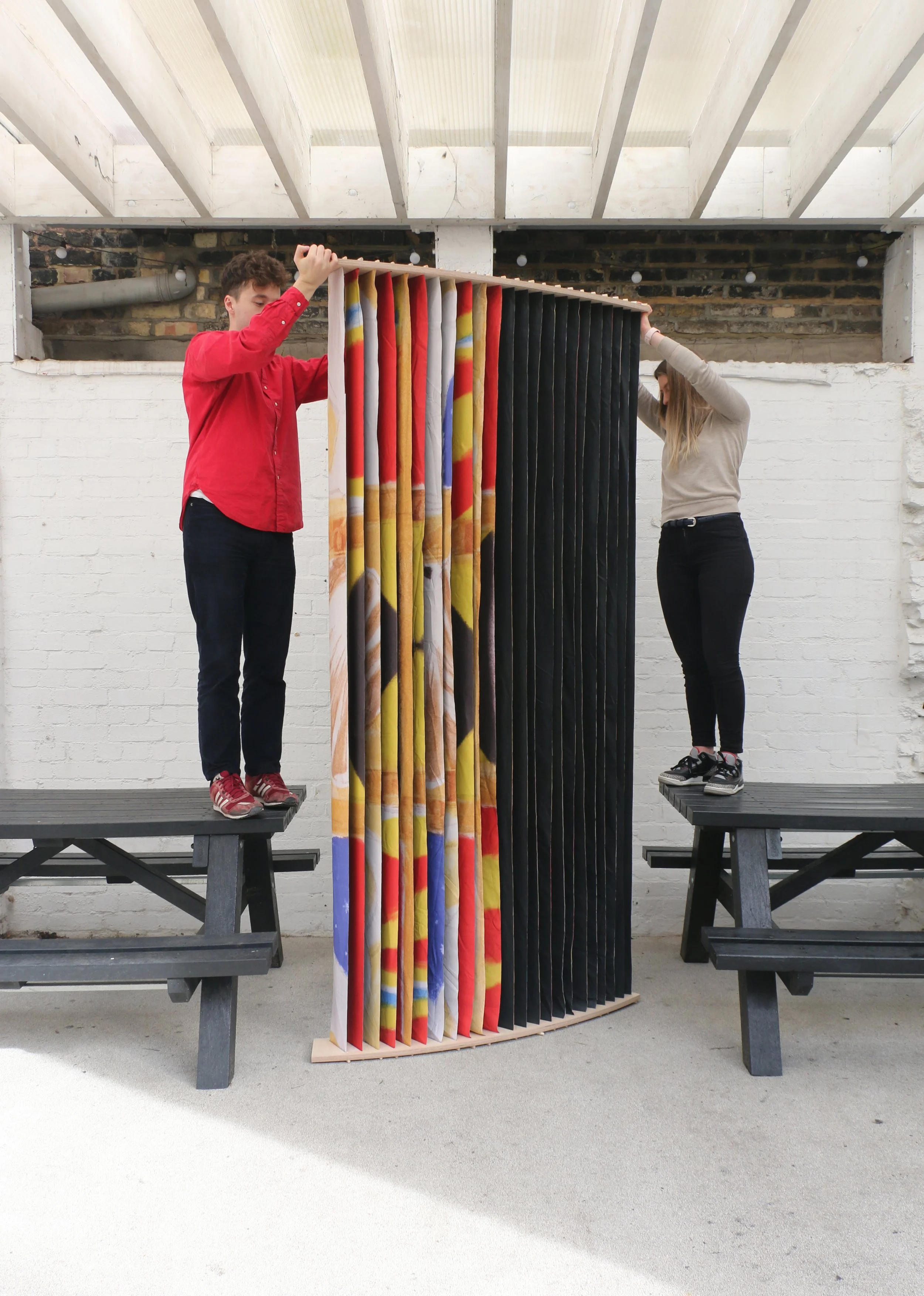 Completed in 2019, the Eco-Visionaries exhibition prioritised reuse and low-impact design, minimising new fabrication and material waste. Existing plinths and furniture were borrowed or salvaged from other exhibitions, while caption ledges were made from recycled wood and board offcuts. These were designed for disassembly and reuse beyond the show. Partition screens were constructed from repurposed promotional banners, developed in collaboration with a textile designer and upcycling specialist. The result was a modular, lightweight system with minimal environmental footprint. Sustainable materials such as plywood, paper, and card were used throughout, avoiding single-use plastics entirely.